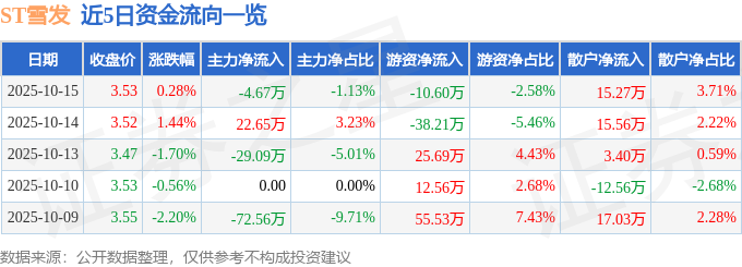 证券之星消息,截至2025年10月15日收盘,ST雪发(002485)报收于3.53元,上涨0.28%,换手率0.22%,成交量1.17万手,成交额411.74万元。