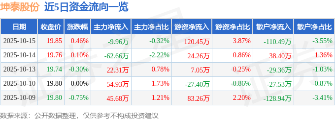 证券之星消息,截至2025年10月15日收盘,坤泰股份(001260)报收于19.85元,上涨0.46%,换手率4.93%,成交量1.57万手,成交额3111.38万元。
