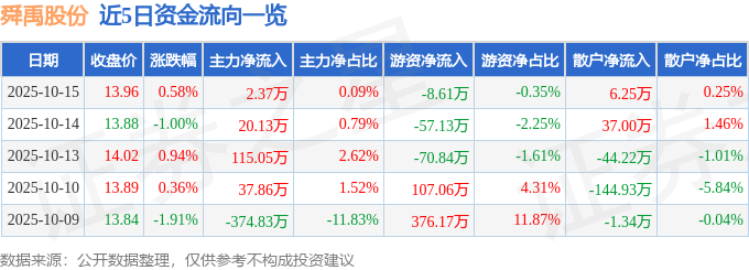 证券之星消息,截至2025年10月15日收盘,舜禹股份(301519)报收于13.96元,上涨0.58%,换手率2.29%,成交量1.79万手,成交额2494.65万元。
