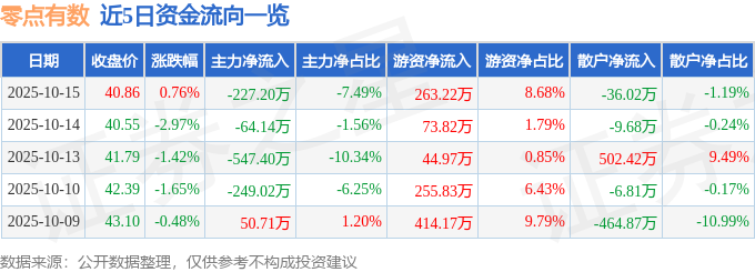 10月15日的资金流向数据方面,主力资金净流出227.2万元,占总成交额7.49%,游资资金净流入263.22万元,占总成交额8.68%,散户资金净流出36.02万元,占总成交额1.19%。