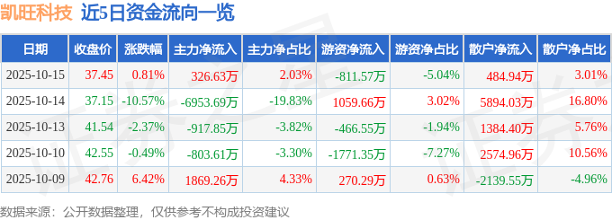 证券之星消息,截至2025年10月15日收盘,凯旺科技(301182)报收于37.45元,上涨0.81%,换手率4.52%,成交量4.33万手,成交额1.61亿元。