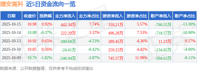 证券之星消息,截至2025年10月15日收盘,捷安高科(300845)报收于10.98元,上涨0.92%,换手率3.63%,成交量5.22万手,成交额5717.29万元。
