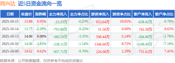 10月15日的资金流向数据方面,主力资金净流出15.23万元,占总成交额0.23%,游资资金净流入653.64万元,占总成交额10.01%,散户资金净流出638.42万元,占总成交额9.78%。