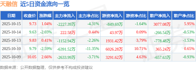 证券之星消息,截至2025年10月15日收盘,天融信(002212)报收于9.73元,上涨1.04%,换手率4.54%,成交量52.92万手,成交额5.17亿元。