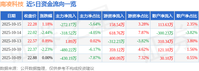 10月15日的资金流向数据方面,主力资金净流出272.17万元,占总成交额5.64%,游资资金净流入158.54万元,占总成交额3.28%,散户资金净流入113.63万元,占总成交额2.35%。