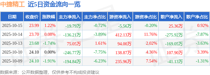 证券之星消息,截至2025年10月15日收盘,中捷精工(301072)报收于23.99元,上涨1.22%,换手率1.72%,成交量1.15万手,成交额2754.18万元。