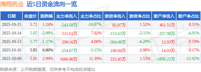 证券之星消息,截至2025年10月15日收盘,海翔药业(002099)报收于5.72元,上涨1.24%,换手率0.59%,成交量9.46万手,成交额5397.55万元。