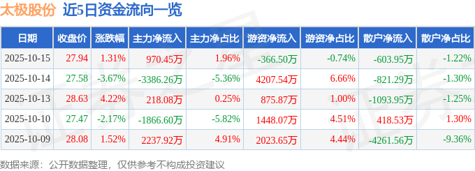 证券之星消息,截至2025年10月15日收盘,太极股份(002368)报收于27.94元,上涨1.31%,换手率2.86%,成交量17.75万手,成交额4.96亿元。