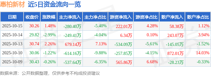 证券之星消息,截至2025年10月15日收盘,惠柏新材(301555)报收于30.26元,上涨1.48%,换手率3.56%,成交量1.72万手,成交额5191.34万元。