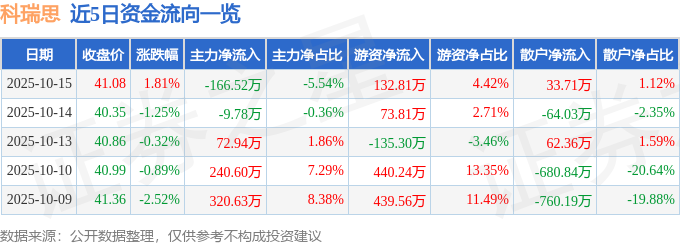 证券之星消息,截至2025年10月15日收盘,科瑞思(301314)报收于41.08元,上涨1.81%,换手率4.5%,成交量7310.0手,成交额3004.18万元。