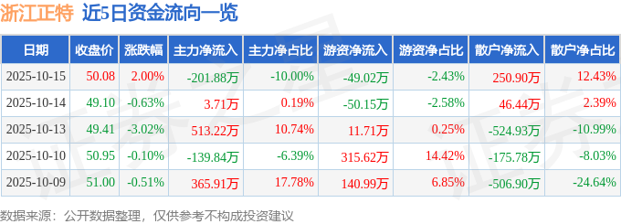 证券之星消息,截至2025年10月15日收盘,浙江正特(001238)报收于50.08元,上涨2.0%,换手率0.39%,成交量4052.0手,成交额2018.12万元。