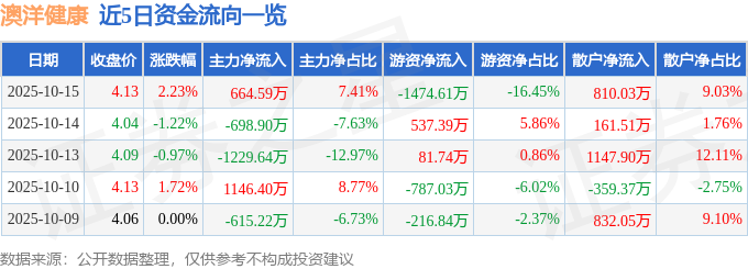 证券之星消息,截至2025年10月15日收盘,澳洋健康(002172)报收于4.13元,上涨2.23%,换手率2.86%,成交量21.85万手,成交额8965.44万元。