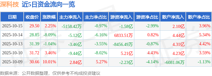 证券之星消息,截至2025年10月15日收盘,深科技(000021)报收于29.5元,上涨2.25%,换手率11.62%,成交量182.06万手,成交额52.96亿元。