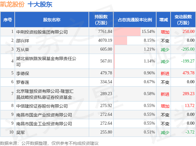 根据凯龙股份2025年中报公布的十大股东详情如下:
