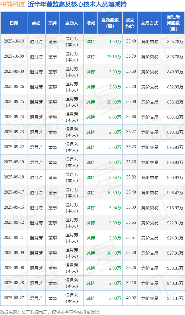 中简科技近半年内的董监高及核心技术人员增减持详情如下: