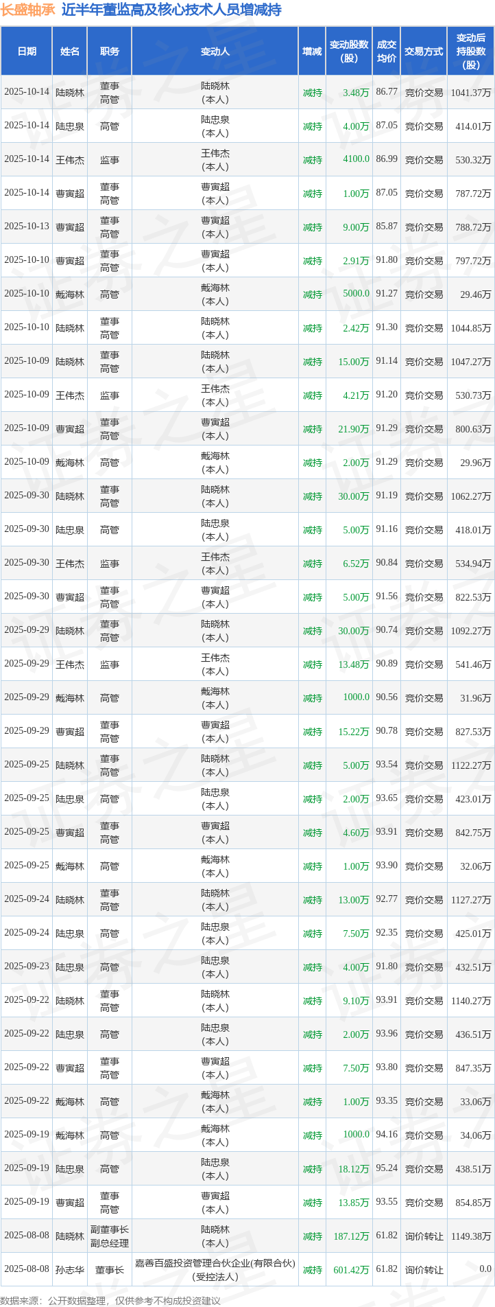 长盛轴承近半年内的董监高及核心技术人员增减持详情如下: