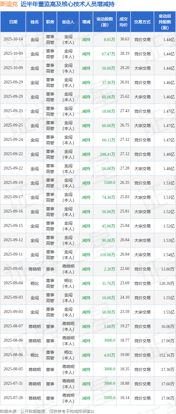 斯迪克近半年内的董监高及核心技术人员增减持详情如下: