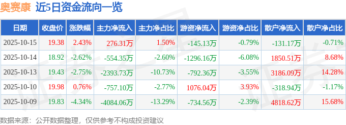 10月15日的资金流向数据方面,主力资金净流入276.31万元,占总成交额1.5%,游资资金净流出145.13万元,占总成交额0.79%,散户资金净流出131.17万元,占总成交额0.71%。