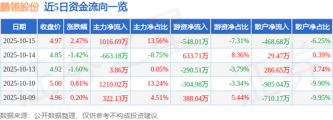 证券之星消息,截至2025年10月15日收盘,鹏翎股份(300375)报收于4.97元,上涨2.47%,换手率3.0%,成交量15.28万手,成交额7496.99万元。