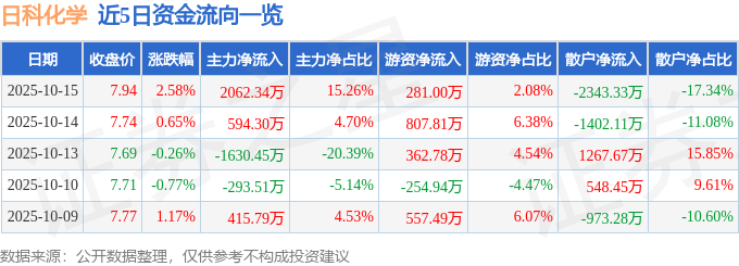 证券之星消息,截至2025年10月15日收盘,日科化学(300214)报收于7.94元,上涨2.58%,换手率4.26%,成交量17.2万手,成交额1.35亿元。