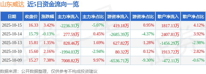证券之星消息,截至2025年10月15日收盘,山东威达(002026)报收于16.33元,上涨3.42%,换手率6.47%,成交量27.35万手,成交额4.41亿元。