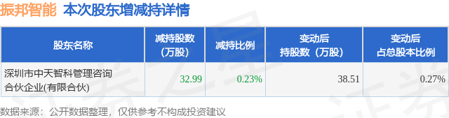 证券之星消息,10月15日振邦智能发布公告《振邦智能:关于股东减持计划时间届满暨实施情况的公告》,其股东深圳市中天智科管理咨询合伙企业(有限合伙)于2025年8月5日至2025年8月11日间合计减持32.99万股,占公司目前总股本的0.2279%,变动期间该股股价上涨14.26%,截止8月11日收盘报36.21元。
