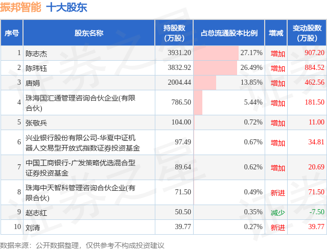 根据振邦智能2025年中报公布的十大股东详情如下: