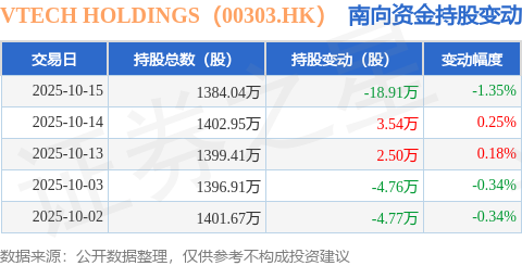 证券之星消息,10月15日南向资金减持18.91万股VTECH HOLDINGS(00303.HK)。近5个交易日中,获南向资金减持的有3天,累计净减持22.4万股。近20个交易日中,获南向资金减持的有9天,累计净减持7.18万股。截至目前,南向资金持有VTECH HOLDINGS(00303.HK)1384.04万股,占公司已发行普通股的5.46%。