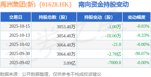 证券之星消息,10月15日南向资金减持1.0万股禹洲集团(新)(01628.HK)。近5个交易日中,获南向资金减持的有5天,累计净减持2.78亿股。近20个交易日中,获南向资金减持的有19天,累计净减持2.33亿股。截至目前,南向资金持有禹洲集团(新)(01628.HK)3053.4万股,占公司已发行普通股的2.04%。