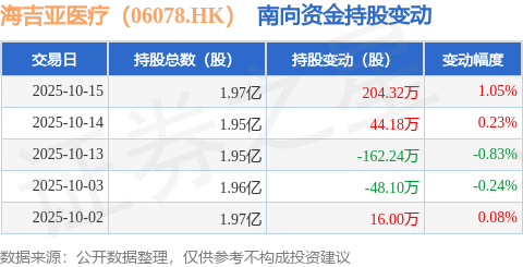 证券之星消息,10月15日南向资金增持204.32万股海吉亚医疗(06078.HK)。近5个交易日中,获南向资金增持的有3天,累计净增持54.16万股。近20个交易日中,获南向资金增持的有14天,累计净增持1104.62万股。截至目前,南向资金持有海吉亚医疗(06078.HK)1.97亿股,占公司已发行普通股的31.86%。