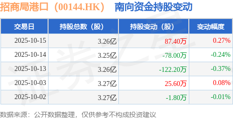 证券之星消息,10月15日南向资金增持87.4万股招商局港口(00144.HK)。近5个交易日中,获南向资金减持的有3天,累计净减持89.0万股。近20个交易日中,获南向资金增持的有10天,累计净增持12.67万股。截至目前,南向资金持有招商局港口(00144.HK)3.26亿股,占公司已发行普通股的7.76%。