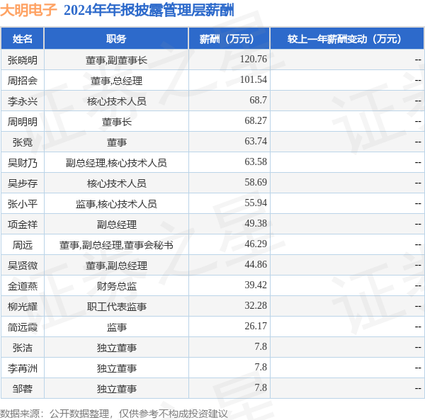 证券之星消息,大明电子发布2024年年报,数据显示:公司主营收入27.27亿元,同比增26.99%。归母净利润为2.82亿元,同比增37.29%。扣非净利润为2.79亿元,同比增42.63%。当年公司员工总数4451人,同比减nan%。人均薪酬12.53万元(注:"人均薪酬"根据定期报告中"应付职工薪酬"附注的本期增加值 / 员工总数计算而来),同比减nan%。人均创收61.27万元,同比减nan%。人均创利6.34万元,同比减nan%。其中管理层薪酬总额为863.02万元,同比上一年增24.1%,薪酬最高的为董事,副董事长张晓明,薪酬120.76万元。