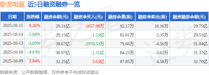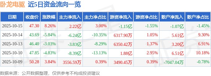 证券之星消息,截至2025年10月15日收盘,卧龙电驱(600580)报收于47.3元,上涨8.26%,换手率10.34%,成交量161.51万手,成交额73.97亿元。