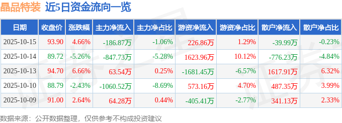 证券之星消息,截至2025年10月15日收盘,晶品特装(688084)报收于93.9元,上涨4.66%,换手率5.4%,成交量1.91万手,成交额1.76亿元。