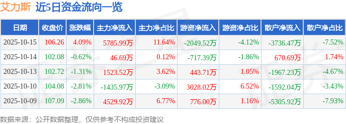 证券之星消息,截至2025年10月15日收盘,艾力斯(688578)报收于106.26元,上涨4.09%,换手率1.05%,成交量4.73万手,成交额4.97亿元。