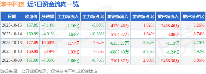 证券之星消息,截至2025年10月15日收盘,淳中科技(603516)报收于157.85元,下跌7.14%,换手率7.16%,成交量14.56万手,成交额22.89亿元。