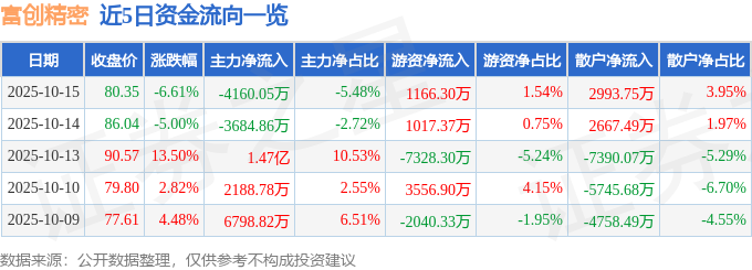 证券之星消息,截至2025年10月15日收盘,富创精密(688409)报收于80.35元,下跌6.61%,换手率3.06%,成交量9.37万手,成交额7.59亿元。