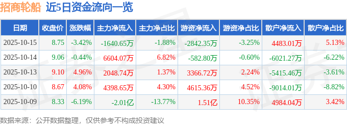 证券之星消息,截至2025年10月15日收盘,招商轮船(601872)报收于8.75元,下跌3.42%,换手率1.24%,成交量100.52万手,成交额8.74亿元。