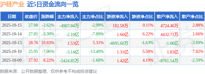 证券之星消息,截至2025年10月15日收盘,沪硅产业(688126)报收于27.08元,下跌2.62%,换手率2.22%,成交量60.68万手,成交额16.42亿元。