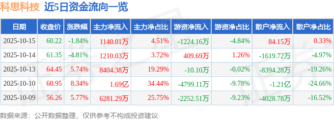证券之星消息,截至2025年10月15日收盘,科思科技(688788)报收于60.22元,下跌1.84%,换手率2.67%,成交量4.19万手,成交额2.53亿元。