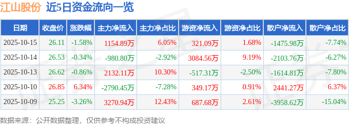 10月15日的资金流向数据方面,主力资金净流入1154.89万元,占总成交额6.05%,游资资金净流入321.09万元,占总成交额1.68%,散户资金净流出1475.98万元,占总成交额7.74%。
