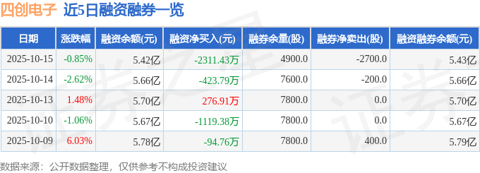 四创电子融资融券信息显示,融资方面,当日融资买入1400.36万元,融资偿还3711.79万元,融资净偿还2311.43万元。融券方面,融券卖出200.0股,融券偿还2900.0股,融券余量4900.0股,融券余额14.28万元。融资融券余额5.43亿元。