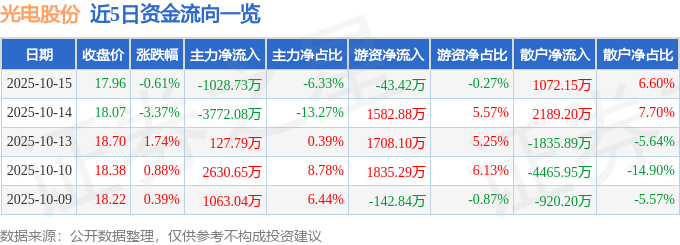 证券之星消息,截至2025年10月15日收盘,光电股份(600184)报收于17.96元,下跌0.61%,换手率1.79%,成交量9.13万手,成交额1.62亿元。