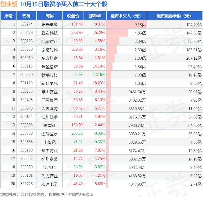 创业板融资净买入前三分别为:阳光电源(300274)融资净买入9.18亿元、胜宏科技(300476)融资净买入4.85亿元、北京君正(300223)融资净买入2.89亿元,前20具体见下表: