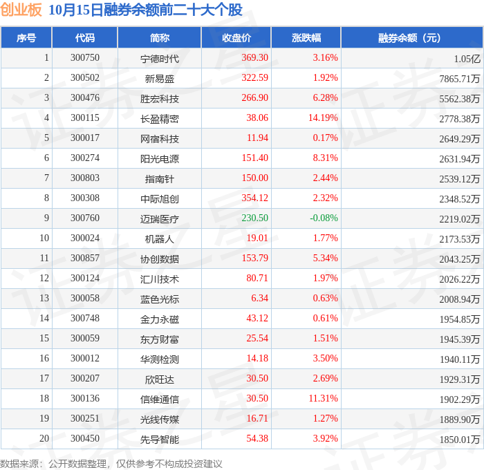 创业板融券余额前三分别为:宁德时代(300750)融券余额1.05亿元、新易盛(300502)融券余额7865.71万元、胜宏科技(300476)融券余额5562.38万元,前20具体见下表: