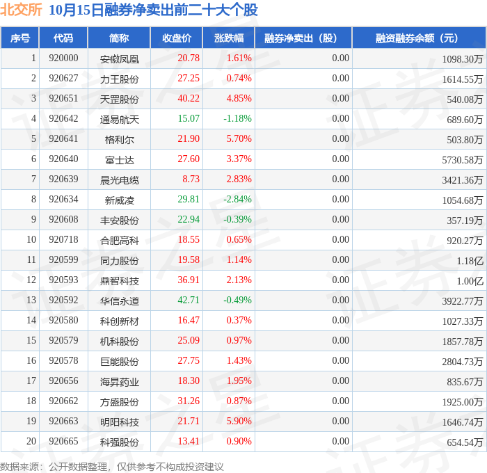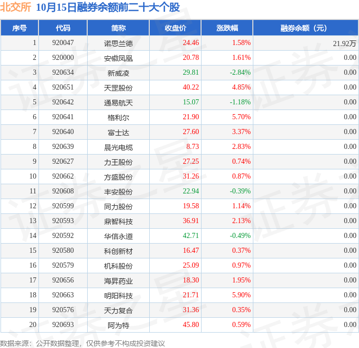 北交所融券余额前三分别为:诺思兰德(920047)融券余额21.92万元,前20具体见下表:
