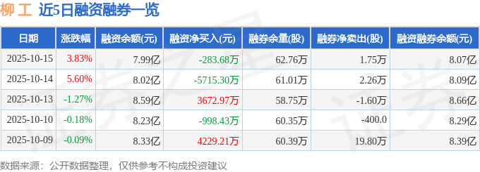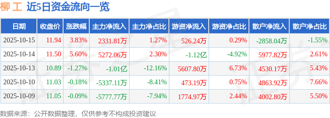 证券之星消息,截至2025年10月15日收盘,柳 工(000528)报收于11.94元,上涨3.83%,换手率7.7%,成交量156.32万手,成交额18.43亿元。