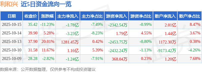 证券之星消息,截至2025年10月15日收盘,利和兴(301013)报收于35.42元,下跌11.23%,换手率35.02%,成交量66.28万手,成交额23.78亿元。