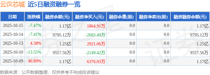 云汉芯城融资融券信息显示,融资方面,当日融资买入5310.23万元,融资偿还3445.32万元,融资净买入1864.91万元。融券方面,融券卖出0.0股,融券偿还0.0股,融券余量0.0股,融券余额0.0万元。融资融券余额1.17亿元。