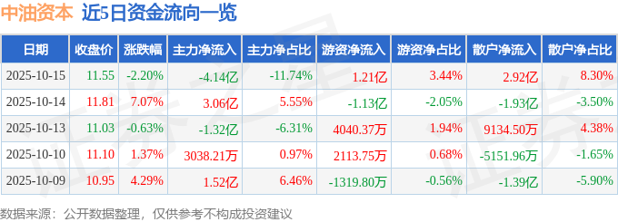 证券之星消息,截至2025年10月15日收盘,中油资本(000617)报收于11.55元,下跌2.2%,换手率2.45%,成交量309.67万手,成交额35.22亿元。